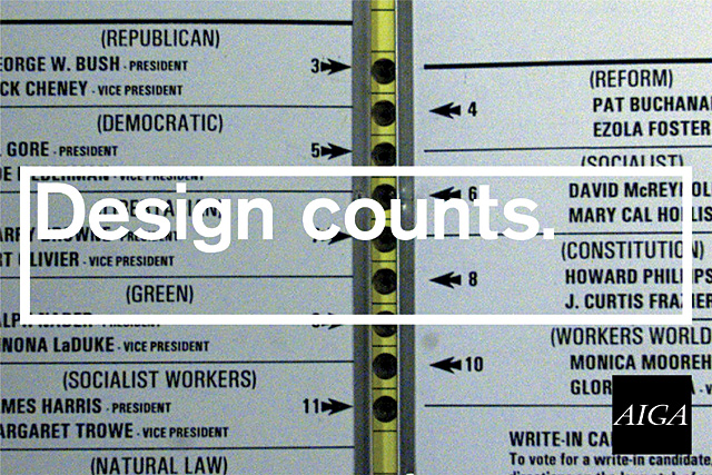Marcia Lausen: Yes. The way that I became involved with Design for Democracy was in reaction to that ballot design. In headlines all over the country were the words “ballot design.” The work of designers in presenting information clearly was not well understood. It was an opportunity to say, “this is what we do.” My reaction had to do with the opportunity.