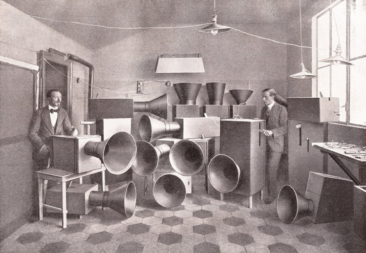 The picture of Russolo and his assistant Ugo Piatti in their sound laboratory in Milan is an important document in the history of experimental music, well known to students of the subject. It was published in 1916 in a book version of the manifesto, and what you see here is the printed reproduction that is always shown, rather than a photographic print—I have never seen the original and it may not have survived. When I first encountered the image many years ago, I knew nothing about its place in the history of Futurist music. I was spellbound. The scene was achingly mysterious and seemed to imply the existence of an arcane early branch of sound technology as curious and irretrievable today as the pneumatic tube compressed-air system introduced in the 19th century to deliver the mail. I kept a photocopy in a file of unusual photos. Annoyingly, after preserving the picture for many years, at the moment I decide to write about it, the file and the copy have vanished.